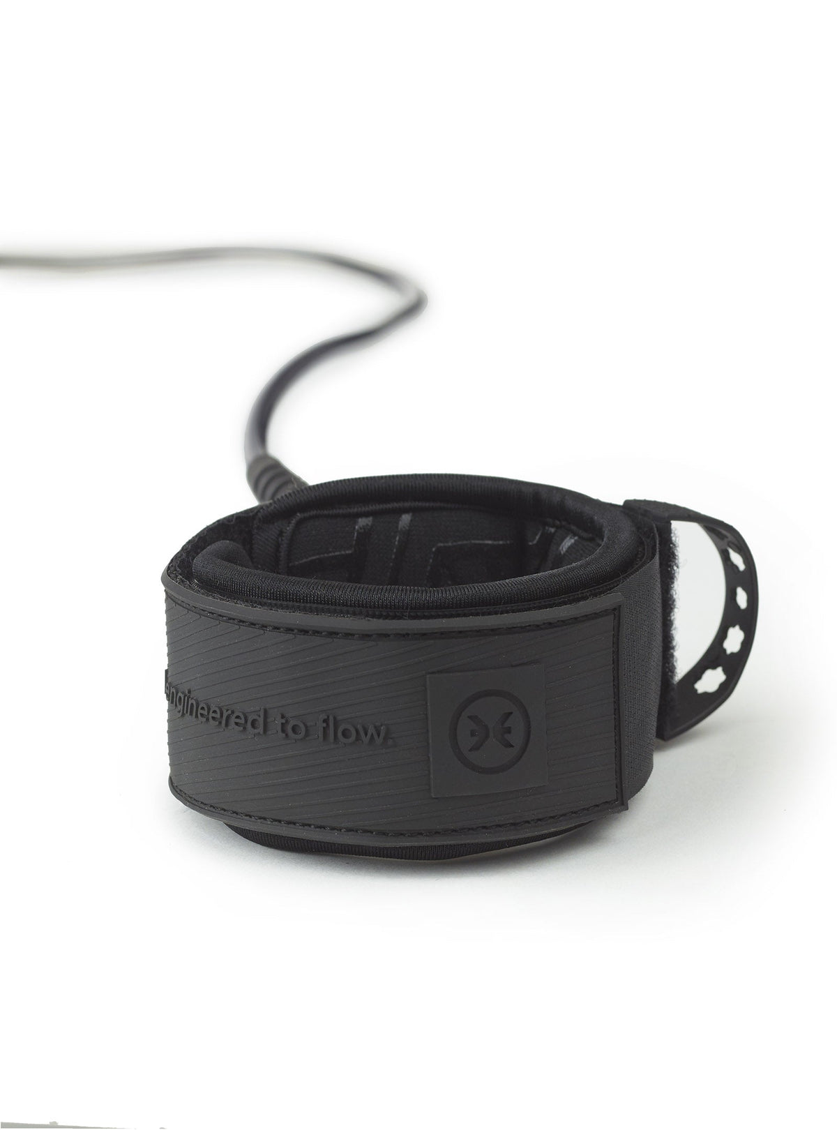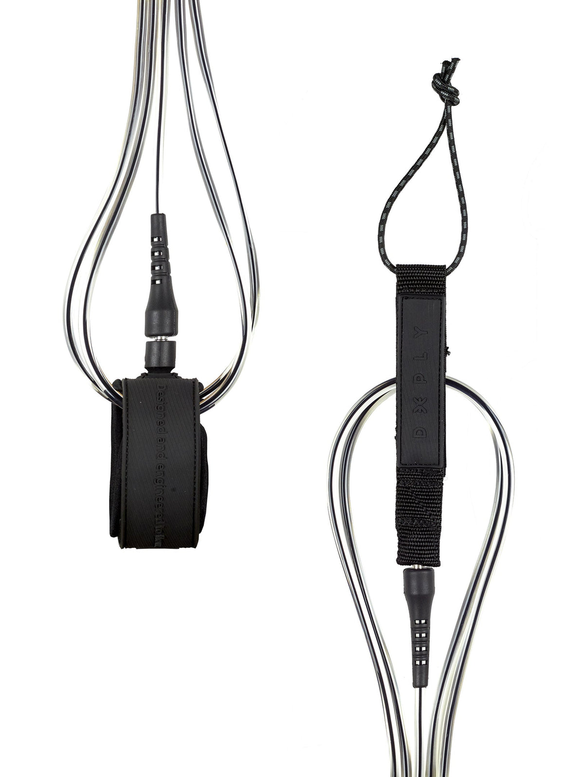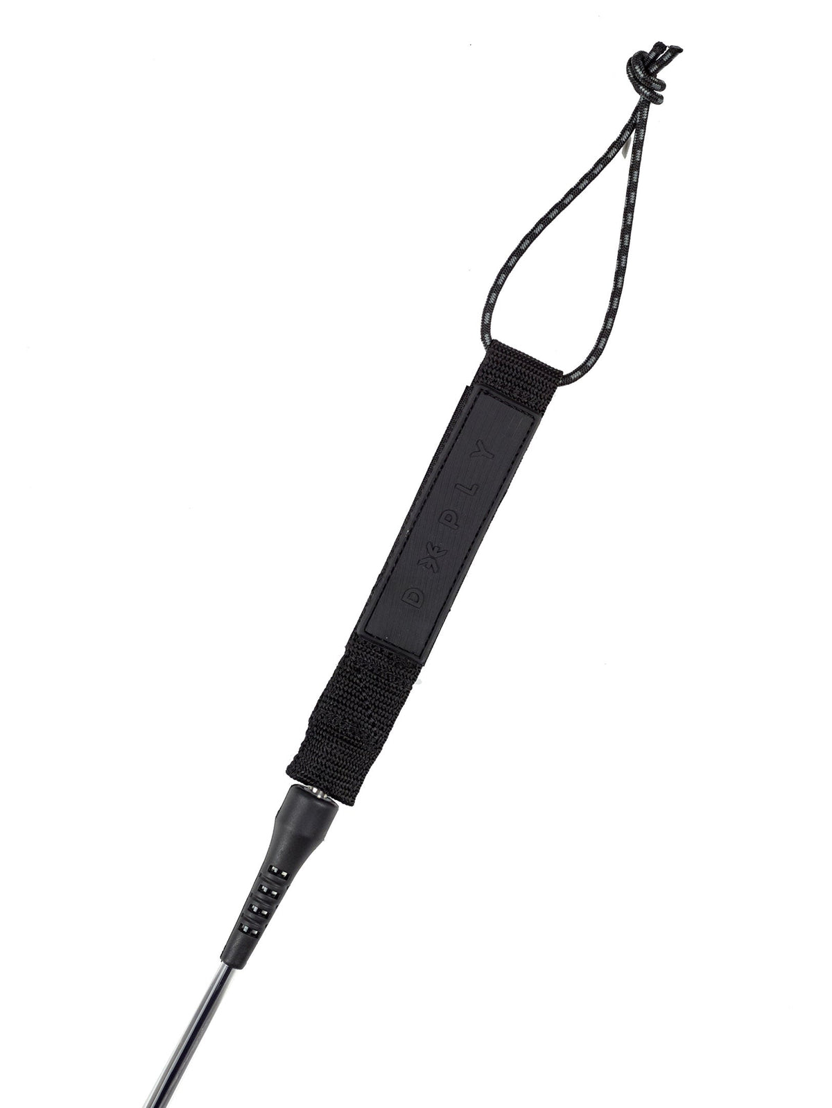Leash noir Deeply de 7 pieds de longueur, en uréthane durable, avec double pivot en acier inoxydable et manchette rembourrée en néoprène. La manchette du leash est munie d’un patch de caoutchouc à dégagement rapide en cas d’urgence.