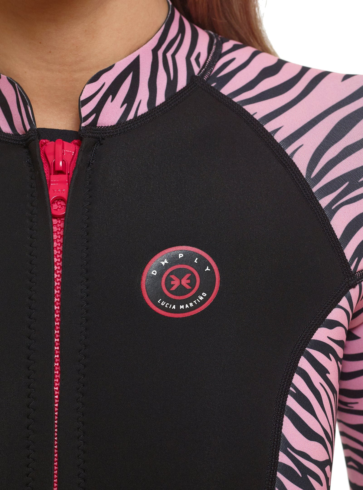 Combinaison pour femme d’une épaisseur de 2/2 mm manches longues, avec un imprimé dominant réalisé en collaboration avec Lucia Martiño, avec zip poitrine YKK. Recommandée pour surfer avec style dans des eaux chaudes entre 18 et 22º C.