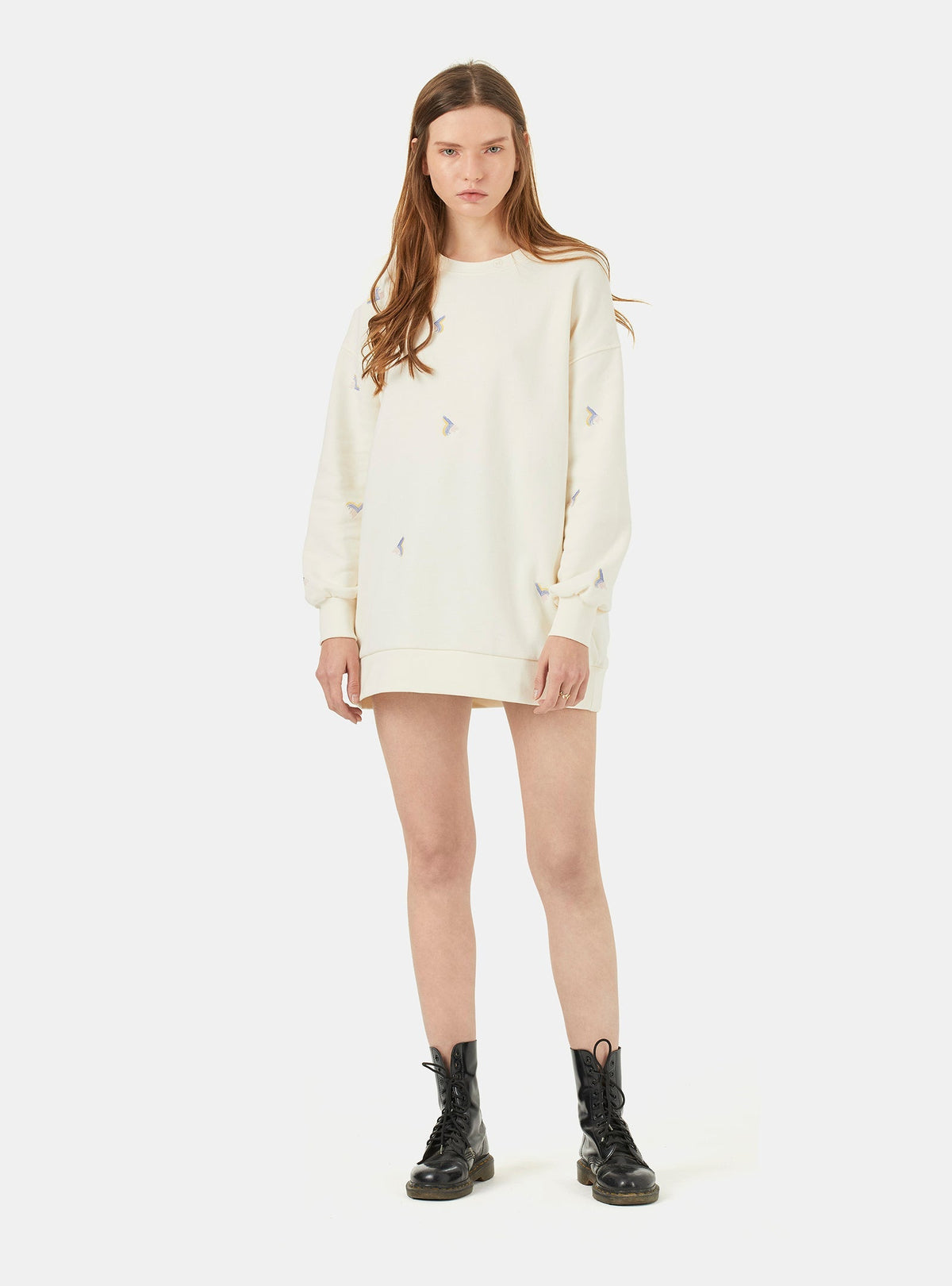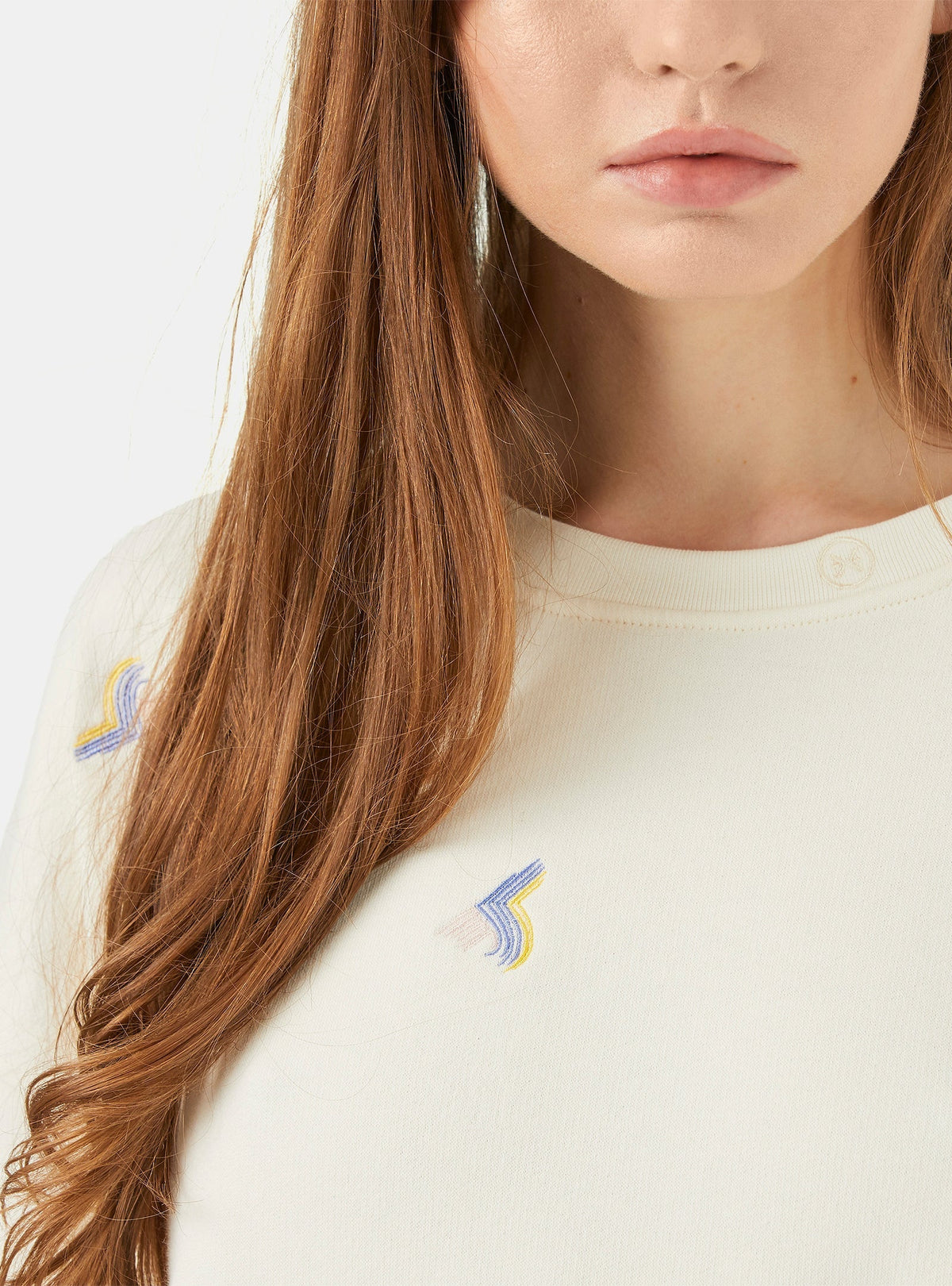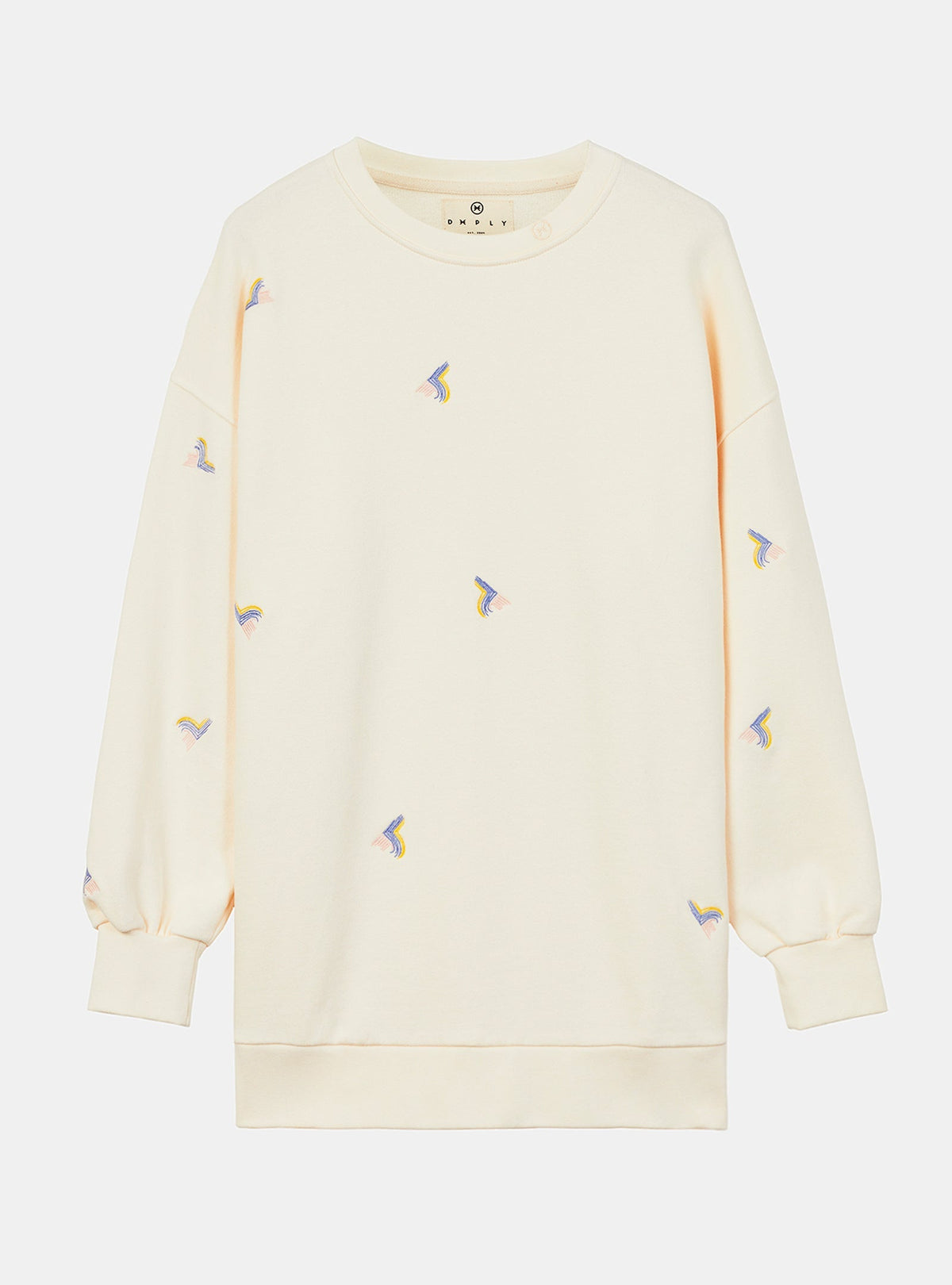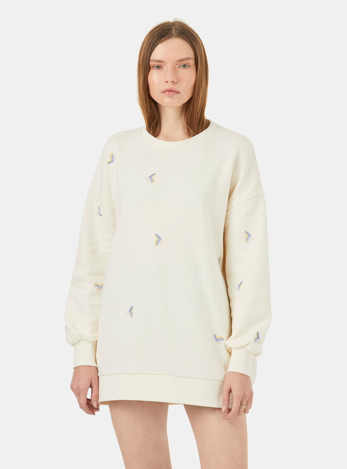 LAST SWELL Un sweat shirt long fabriqué 100 % en coton organique molletonné. Doux au toucher, une texture moelleuse à l´intérieur et une broderie originale sur un graphisme qui recouvre toute la pièce et un design d’ondes de couleur pastel. Une bande 1 x 1 au cou et aux poignets pour un confort extra et des finitions bien définies de qualité avec un recouvrement de la couture du cou assorti à la couleur de fond. Une broderie de la marque au niveau de la poitrine.