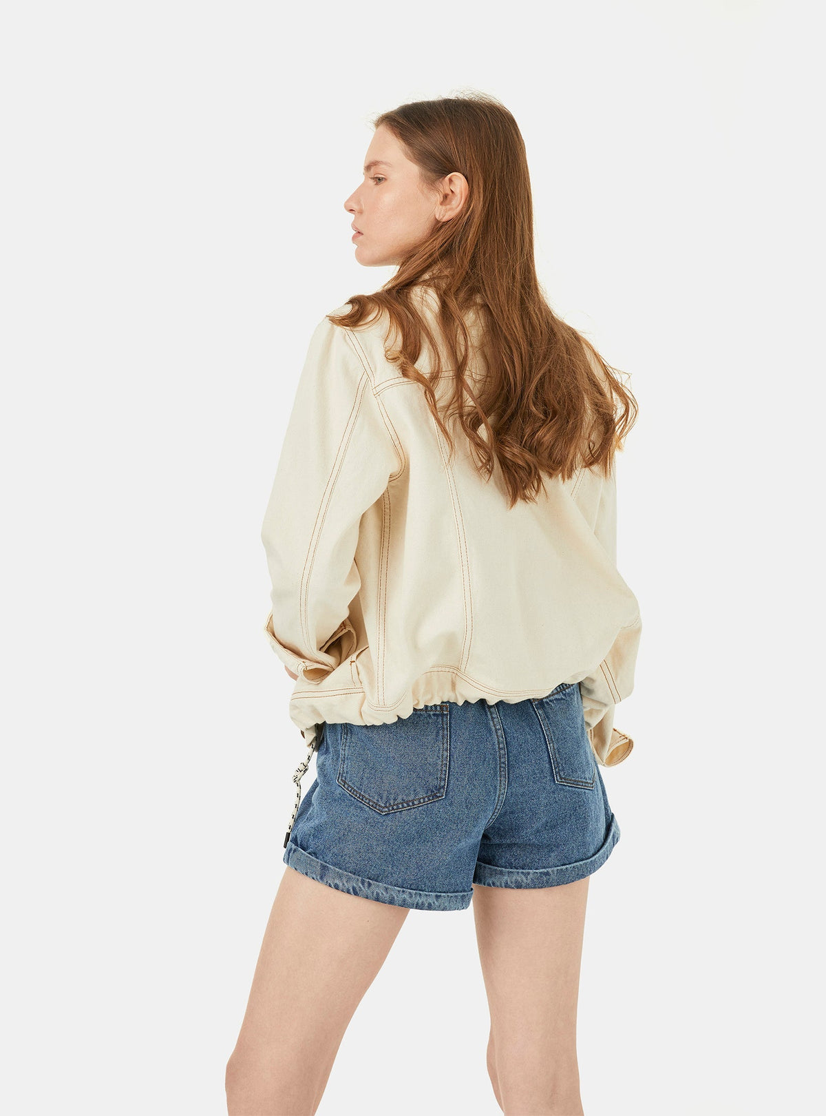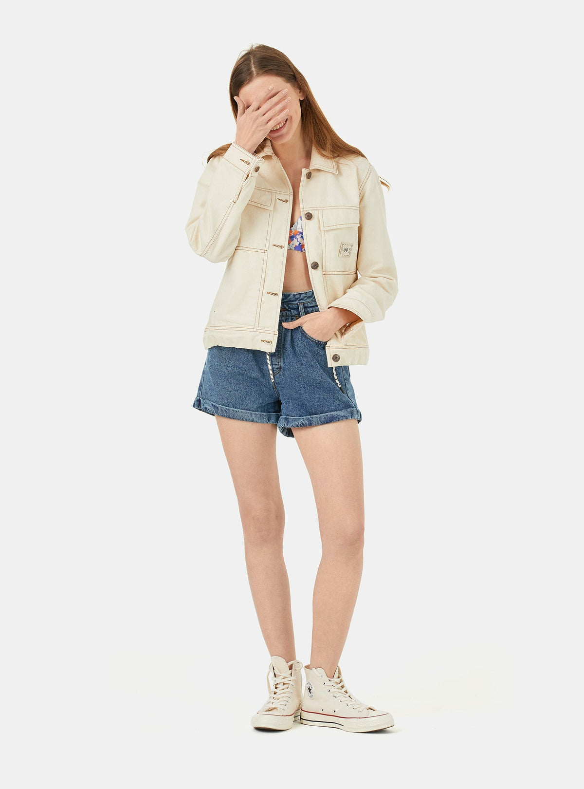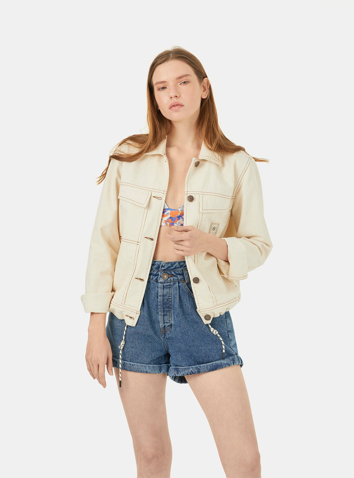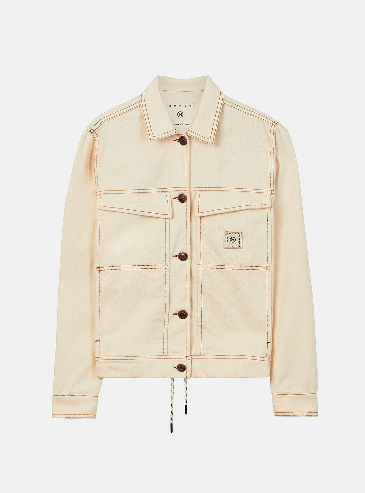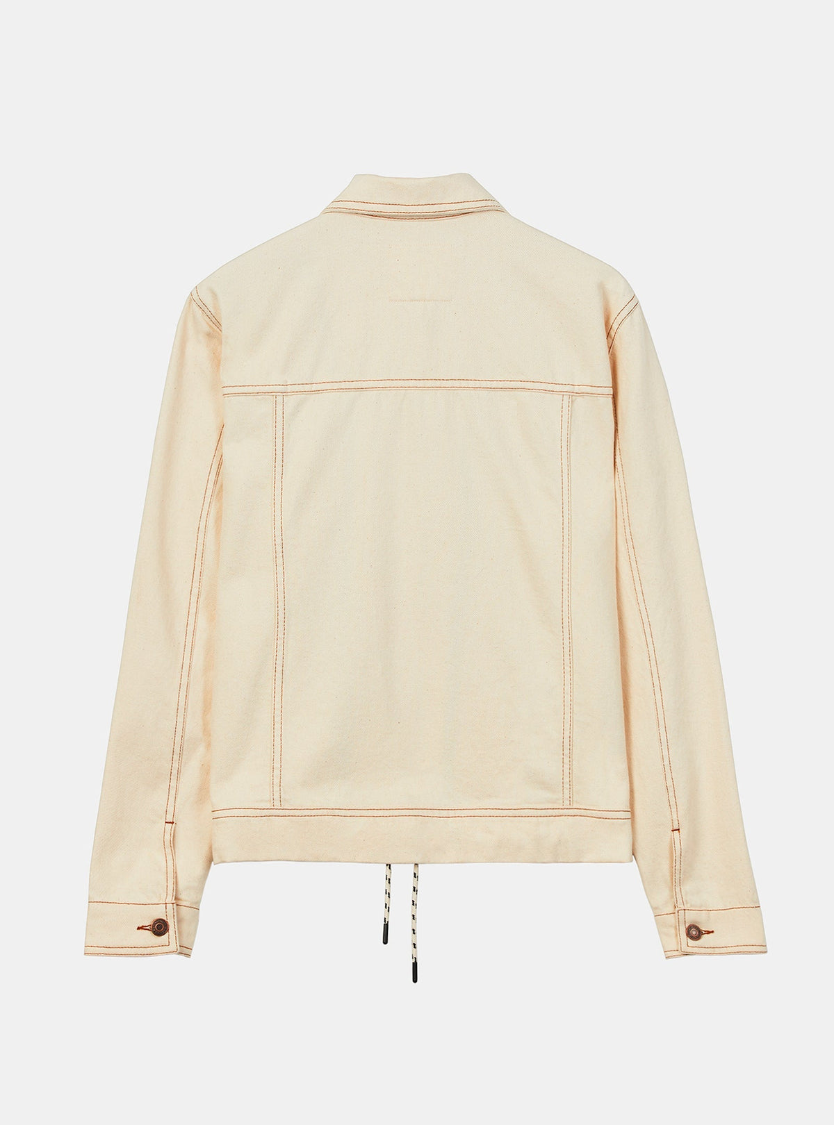 Une longue veste trucker en blanc cassé, sans lavage de blanchiment, inspirée des vêtements de travail. En observant de très près, on peut voir les petits détails marron du coton. Fabriquée en toile de coton épais organique et recyclé qui est douce au toucher. Un col du genre régulier, plusieurs poches à l’extérieur au total de 4 plus 2 autres secrètes à l’intérieur avec un message de sensibilisation sur un graphisme imprimé. Un patch de la marque sur la poche. Des finitions bien définies de qualité avec une reliure de couleur pop contrastante à l’intérieur. Un empiècement derrière régulier au dos. Les poignets ont un système de boutons ajustables pour un extra confort et un usage plus fonctionnel. Elle a aussi un système de cordons à l’intérieur de la ceinture pour changer et donner du style à la silhouette selon votre personnalité.