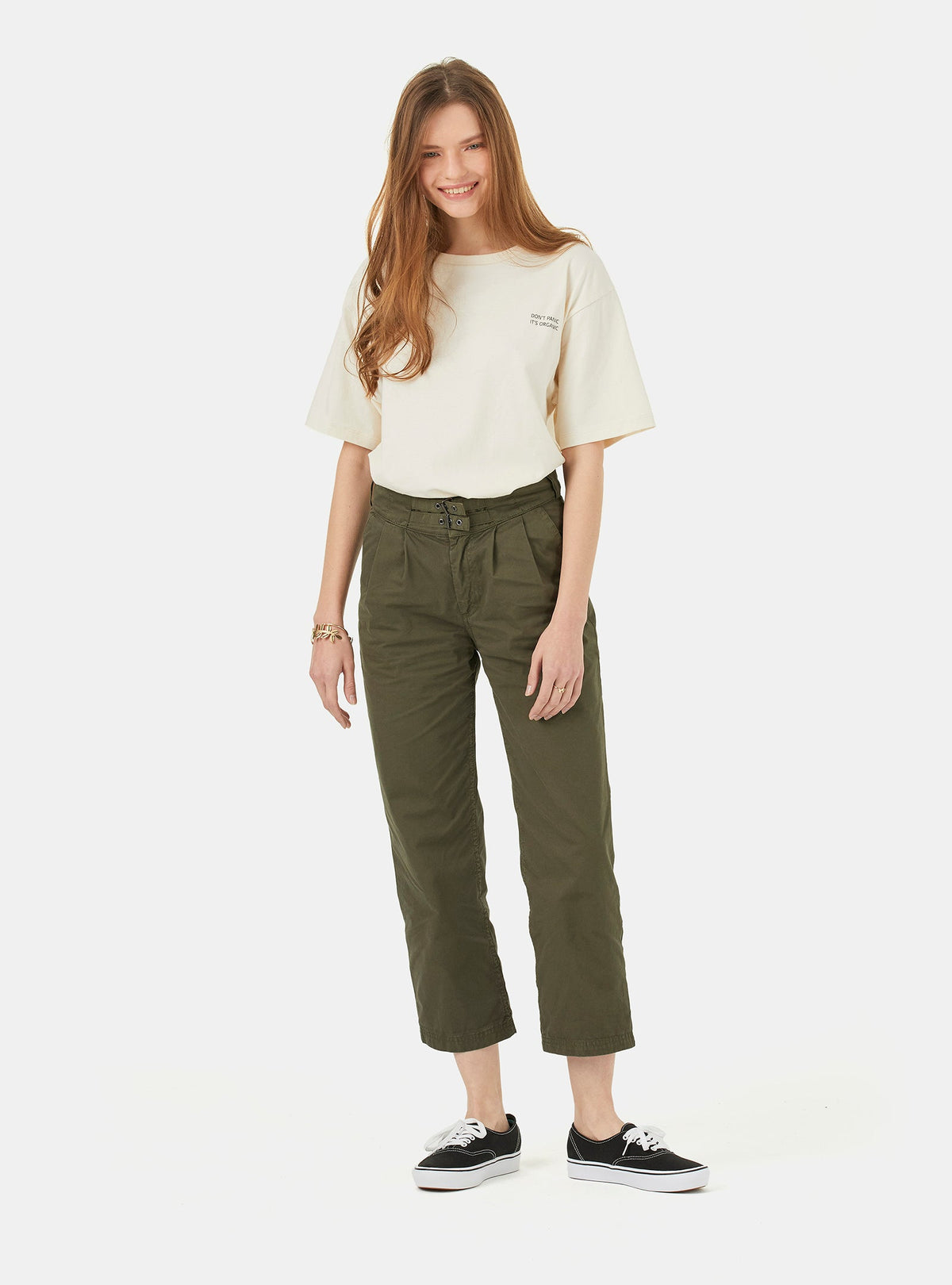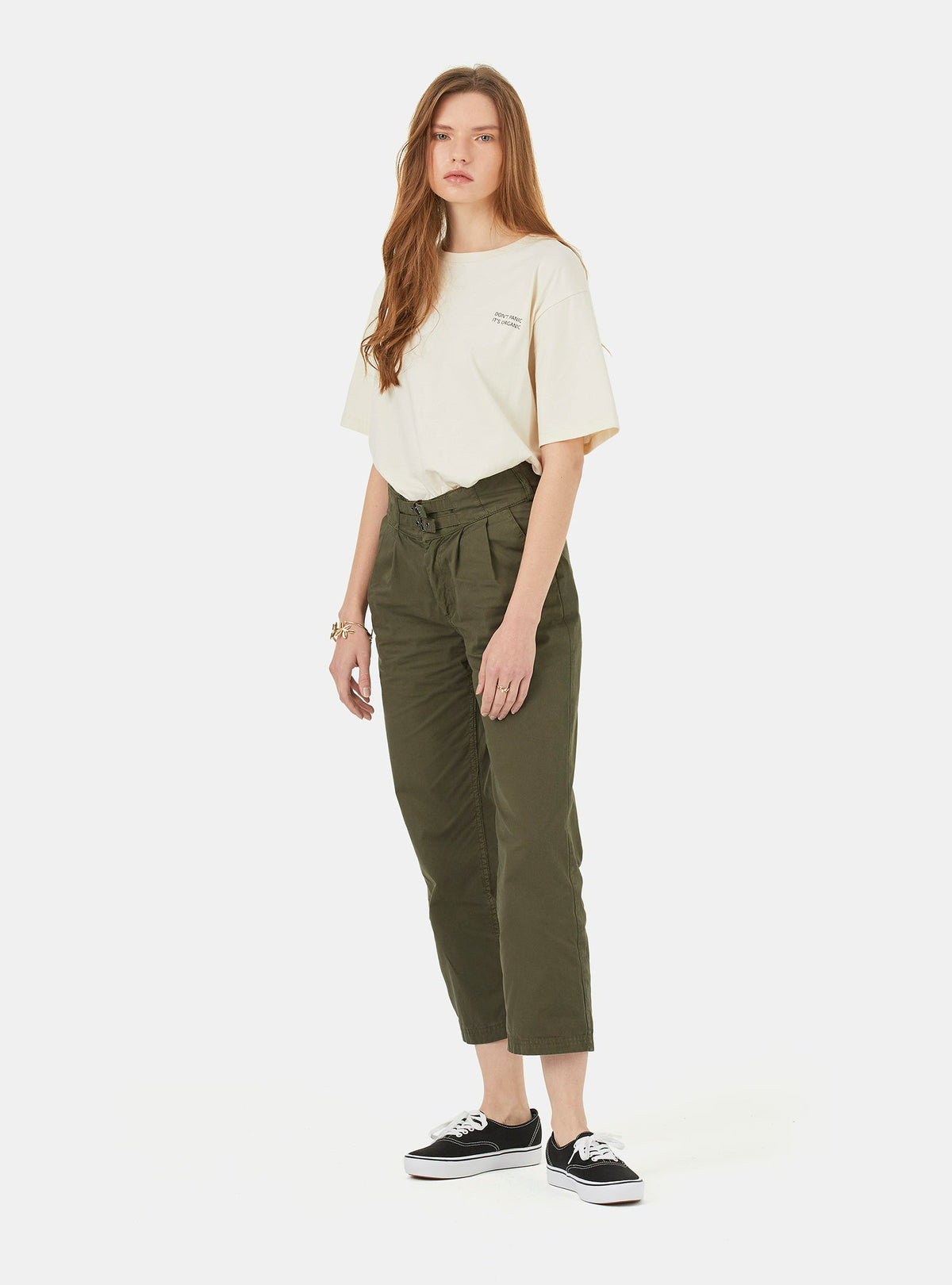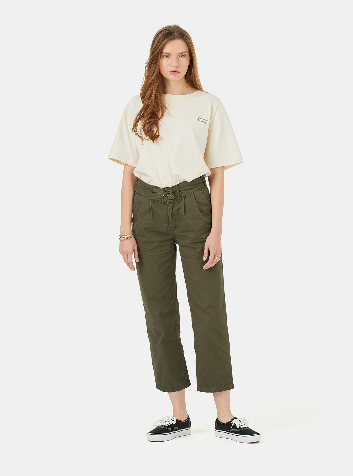 LAST SWELL Un pantalon de coupe régulière à haute ceinture, en kaki et en toile de coton qui lui donne un doux toucher. La haute ceinture avec 2 boucles donnent à cette pièce un look militaire réinventé. Au-devant, 2 plis sur les 2 côtés qui donnent une silhouette tendance et carrée. Deux poches couteau et une patte de boutonnage sur la partie avant avec fermeture éclair. Les coutures anglaises entre les jambes lui donnent une bonne texture lors de son lavage. À l’arrière, une poche plaquée simple avec un léger graphisme imprimé en relief.