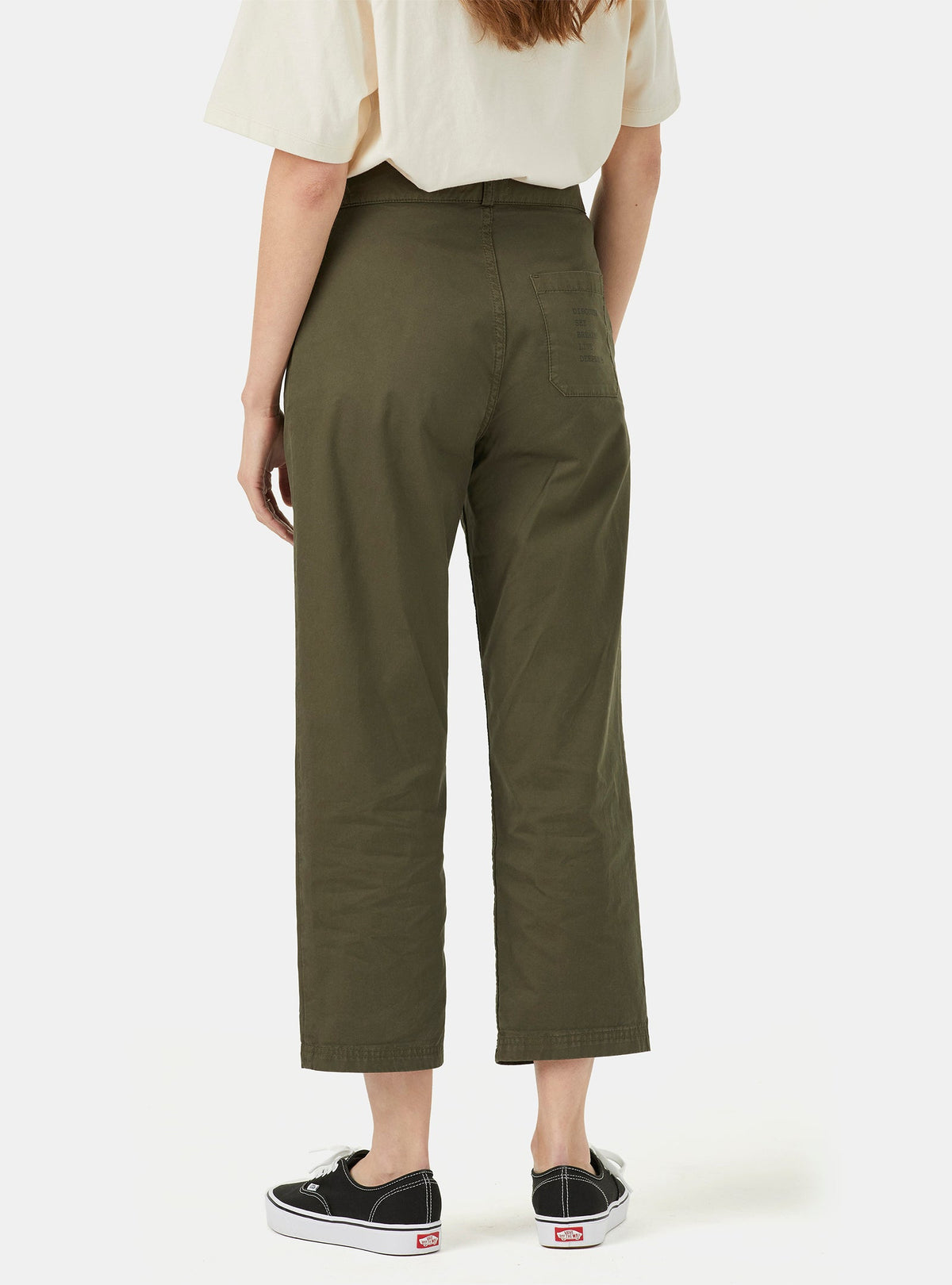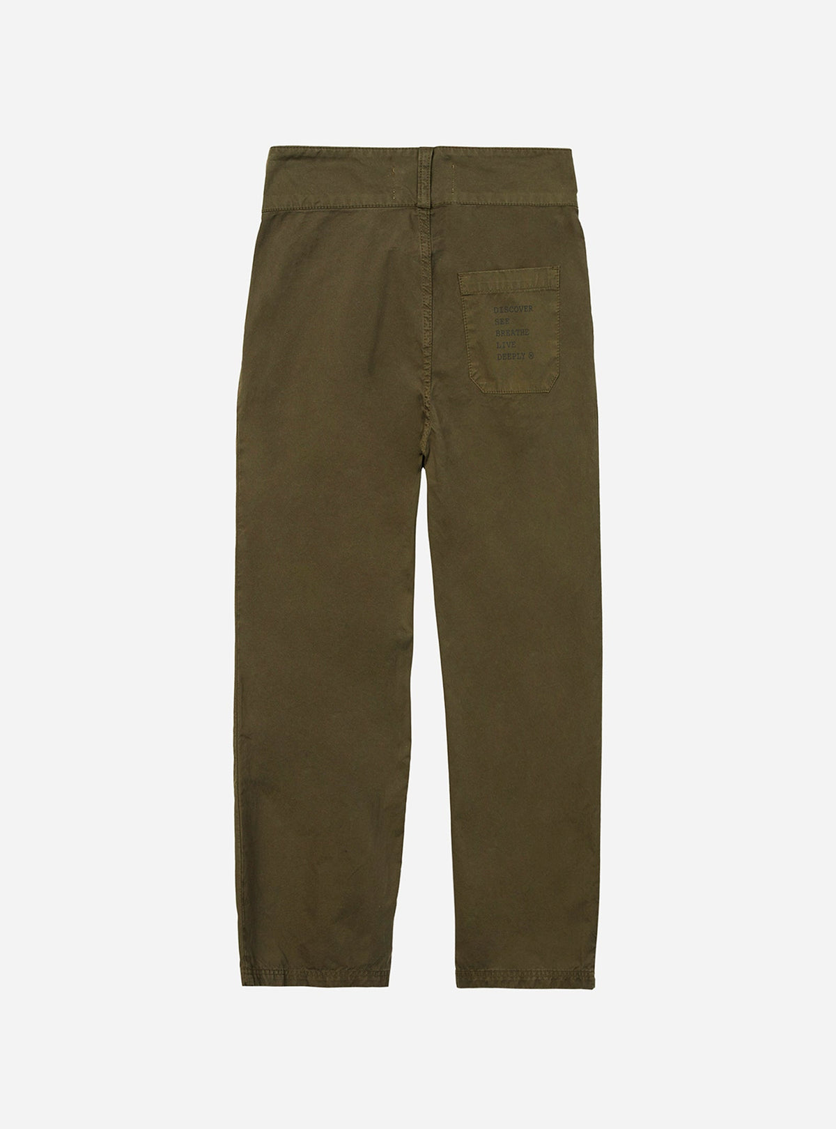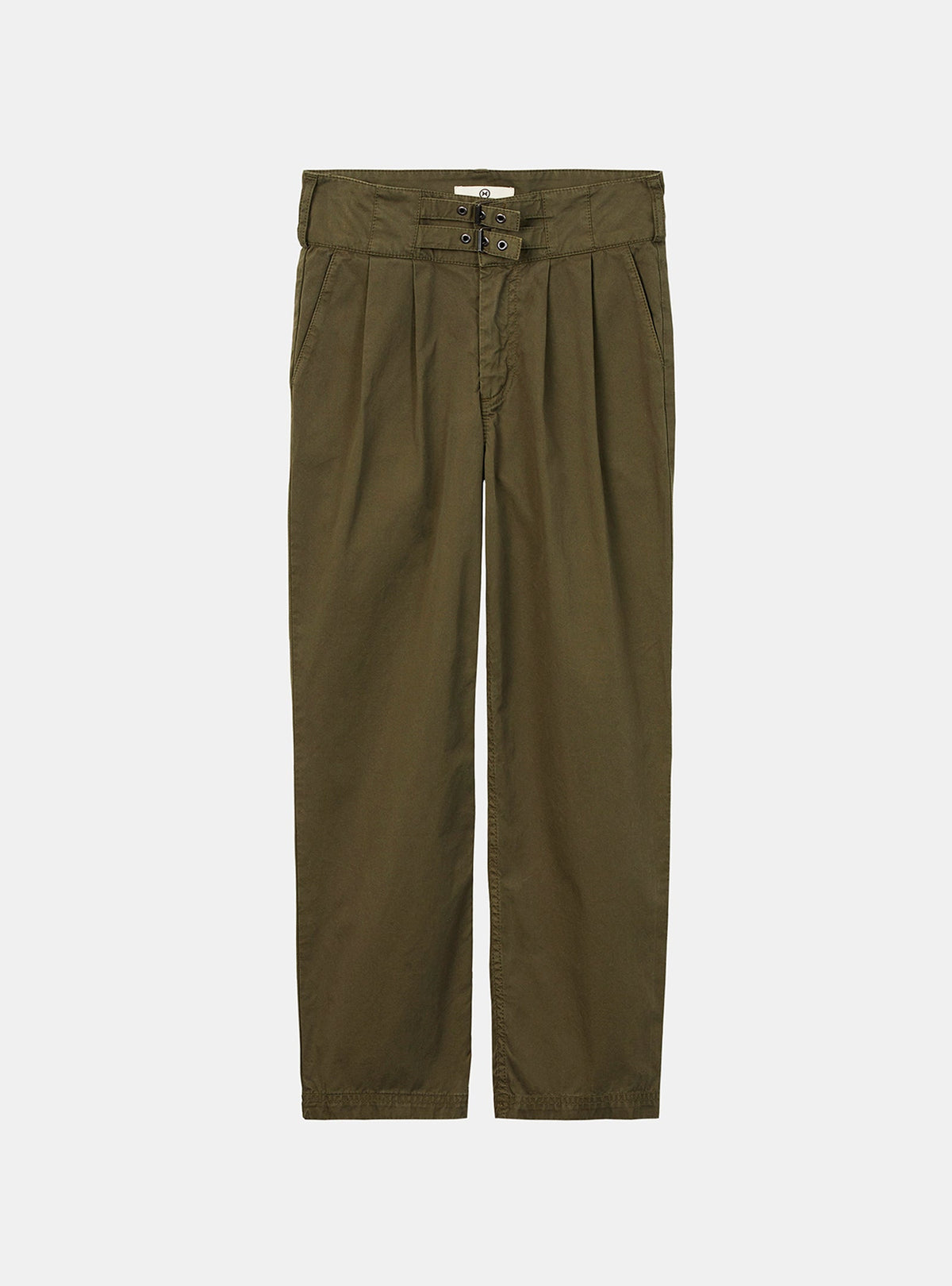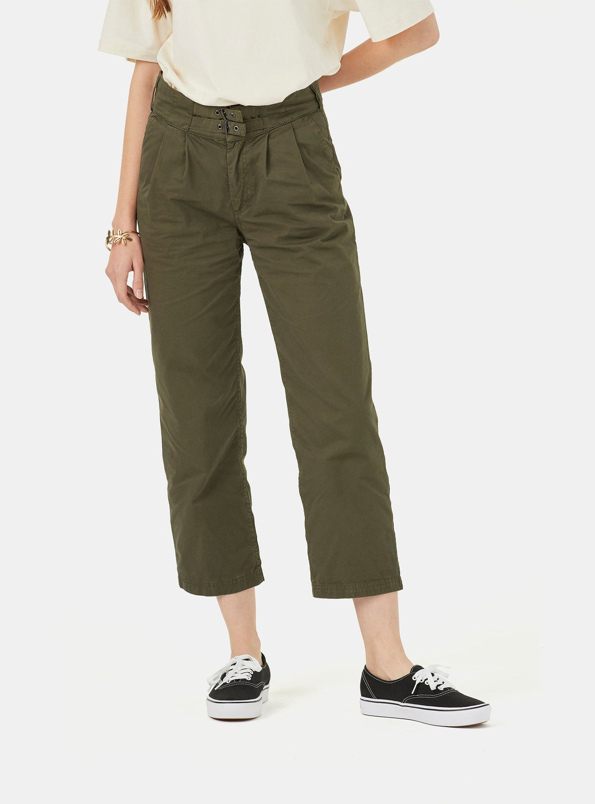 LAST SWELL Un pantalon de coupe régulière à haute ceinture, en kaki et en toile de coton qui lui donne un doux toucher. La haute ceinture avec 2 boucles donnent à cette pièce un look militaire réinventé. Au-devant, 2 plis sur les 2 côtés qui donnent une silhouette tendance et carrée. Deux poches couteau et une patte de boutonnage sur la partie avant avec fermeture éclair. Les coutures anglaises entre les jambes lui donnent une bonne texture lors de son lavage. À l’arrière, une poche plaquée simple avec un léger graphisme imprimé en relief.