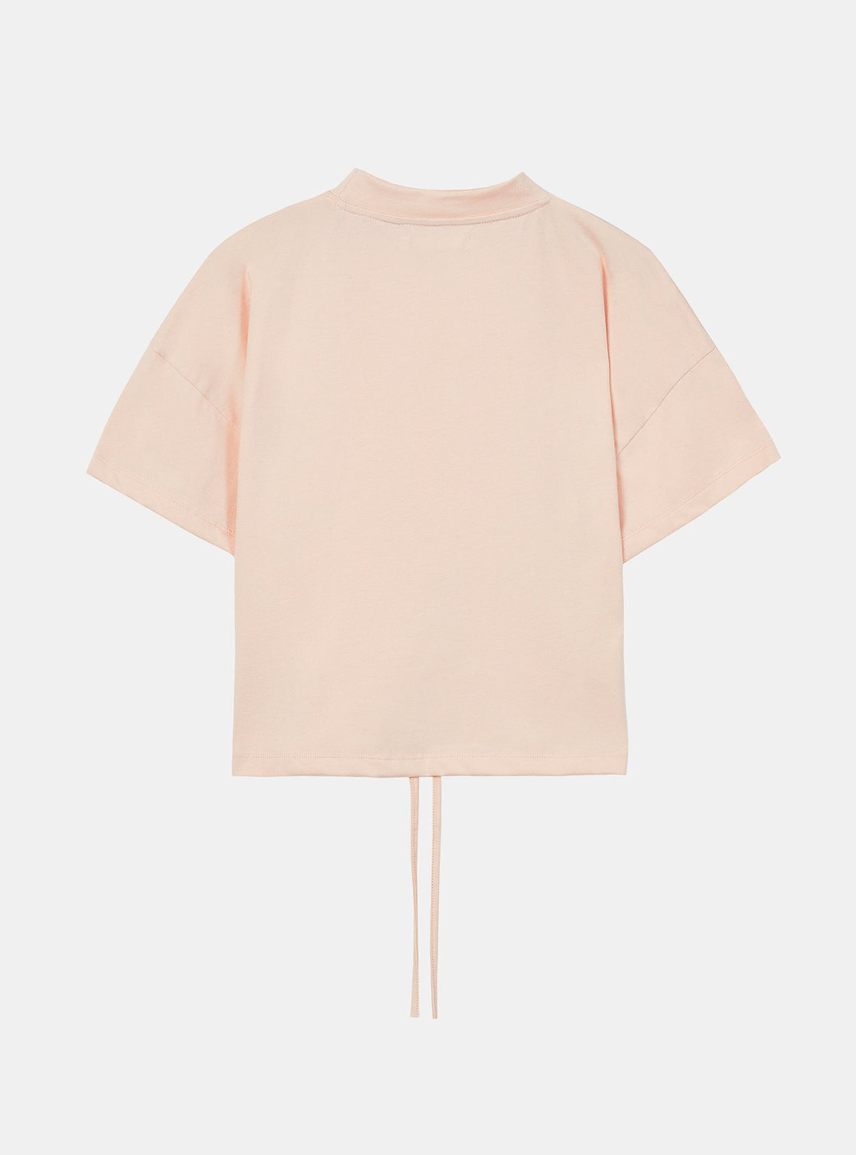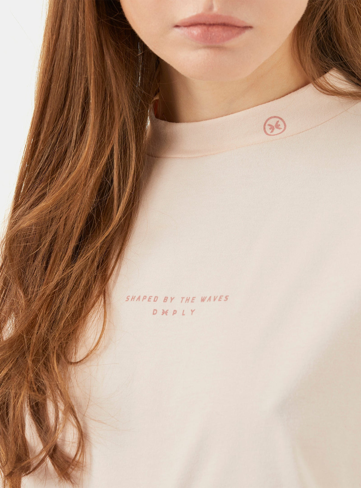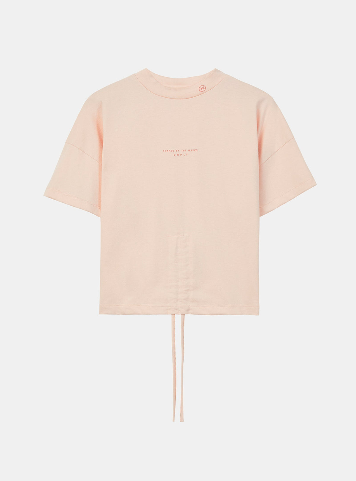 Un T-shirt court avec un col roulé et des épaules larges. Fabriqué en coton qui est doux au toucher. Au-devant, le bas a un système de cordons ce qui donne à la pièce une flexibilité de coupe double pour un usage plus fonctionnel. Au-devant, on a un petit imprimé Deeply au cou et un imprimé relevée au niveau du centre de la poitrine, assorti à la couleur de fond. Le T-shirt est aussi disponible en rose clair.