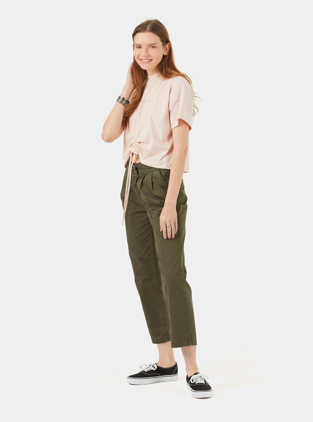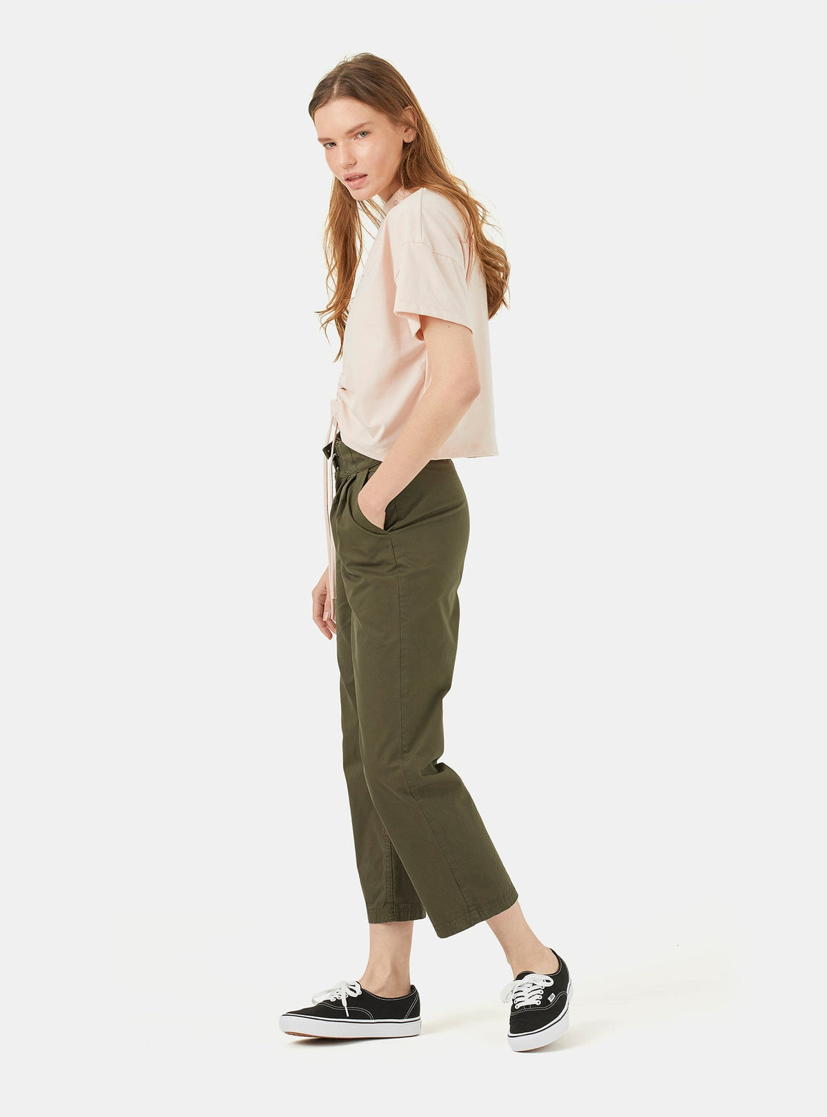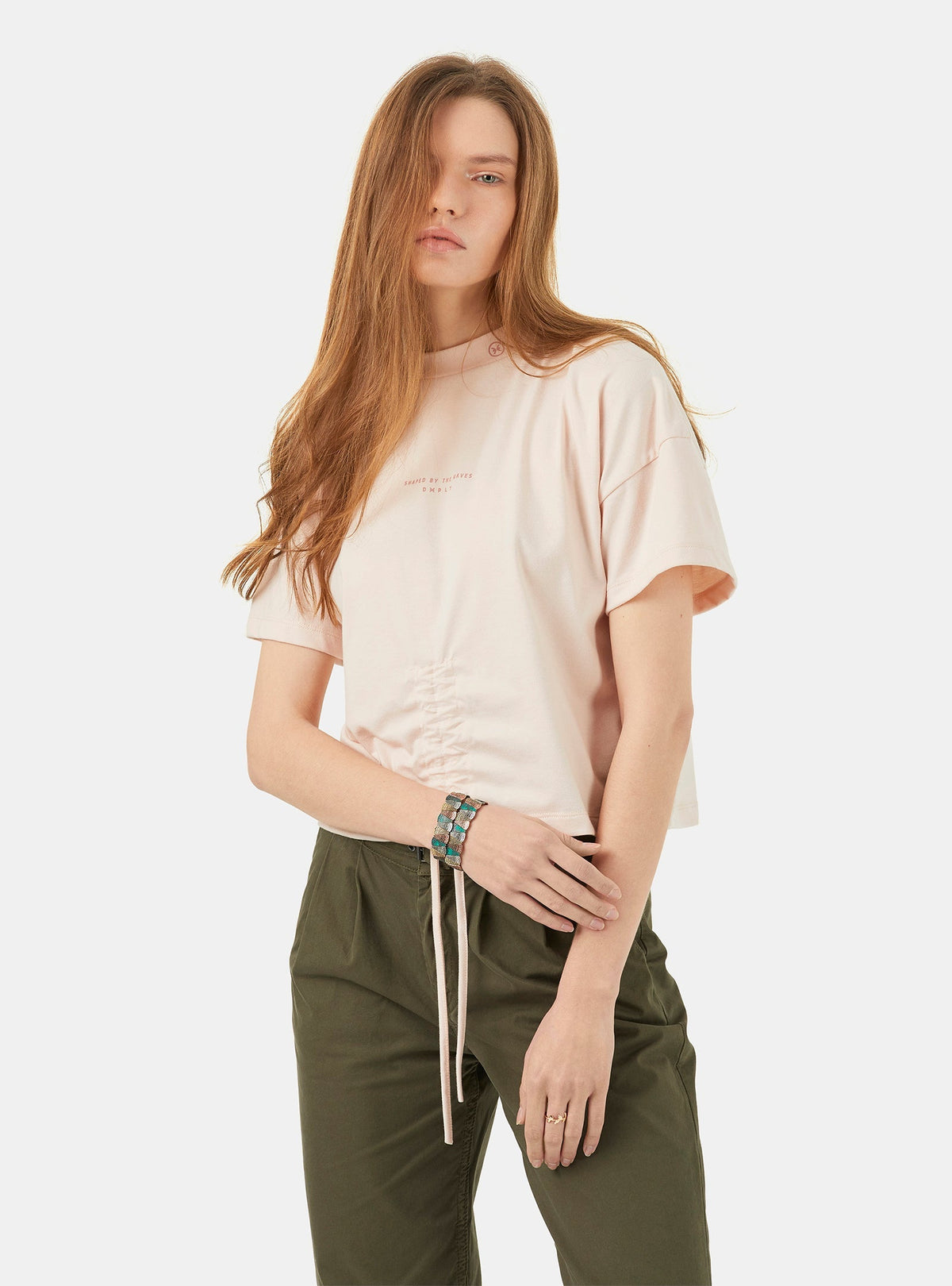 Un T-shirt court avec un col roulé et des épaules larges. Fabriqué en coton qui est doux au toucher. Au-devant, le bas a un système de cordons ce qui donne à la pièce une flexibilité de coupe double pour un usage plus fonctionnel. Au-devant, on a un petit imprimé Deeply au cou et un imprimé relevée au niveau du centre de la poitrine, assorti à la couleur de fond. Le T-shirt est aussi disponible en rose clair.