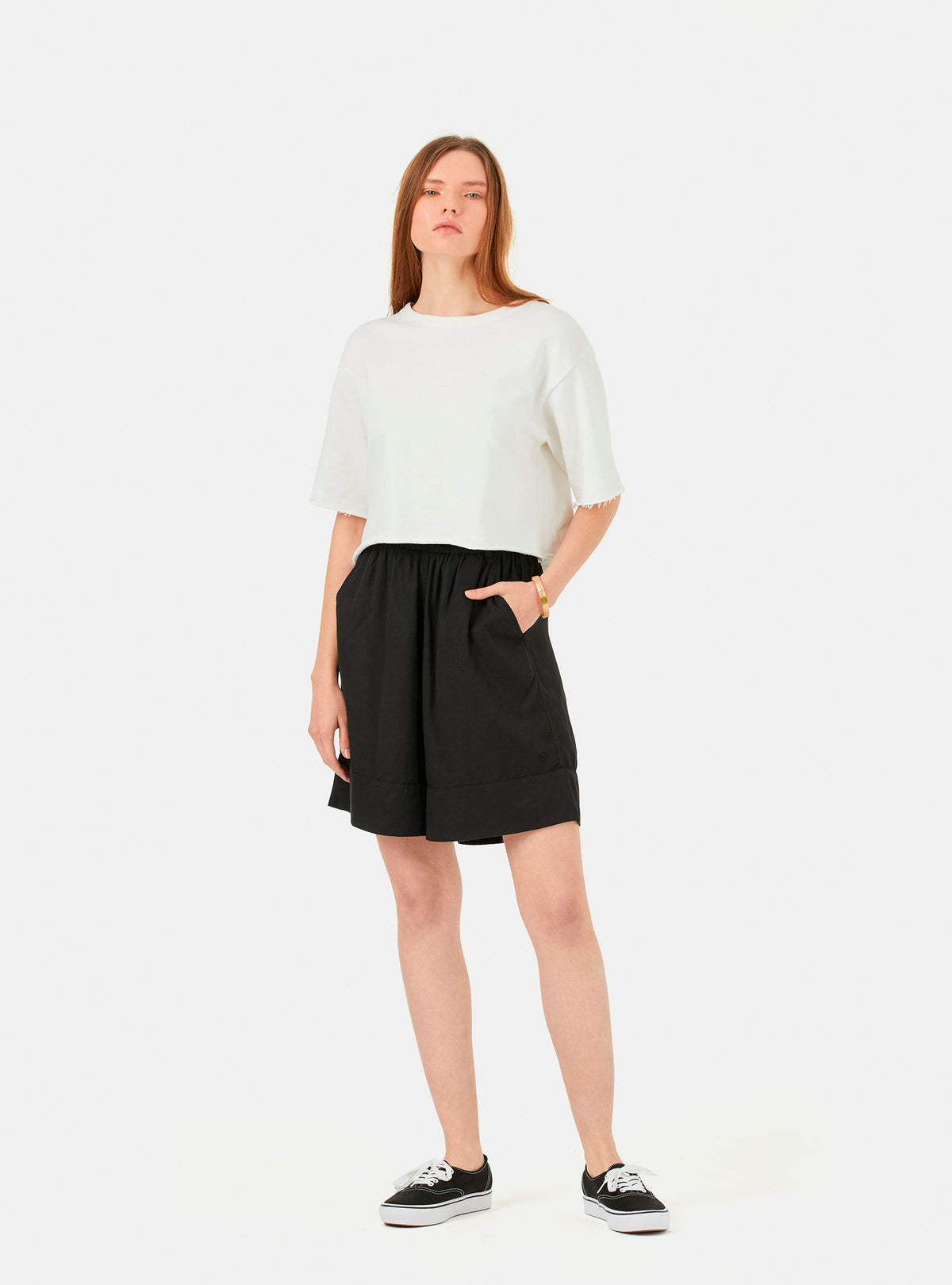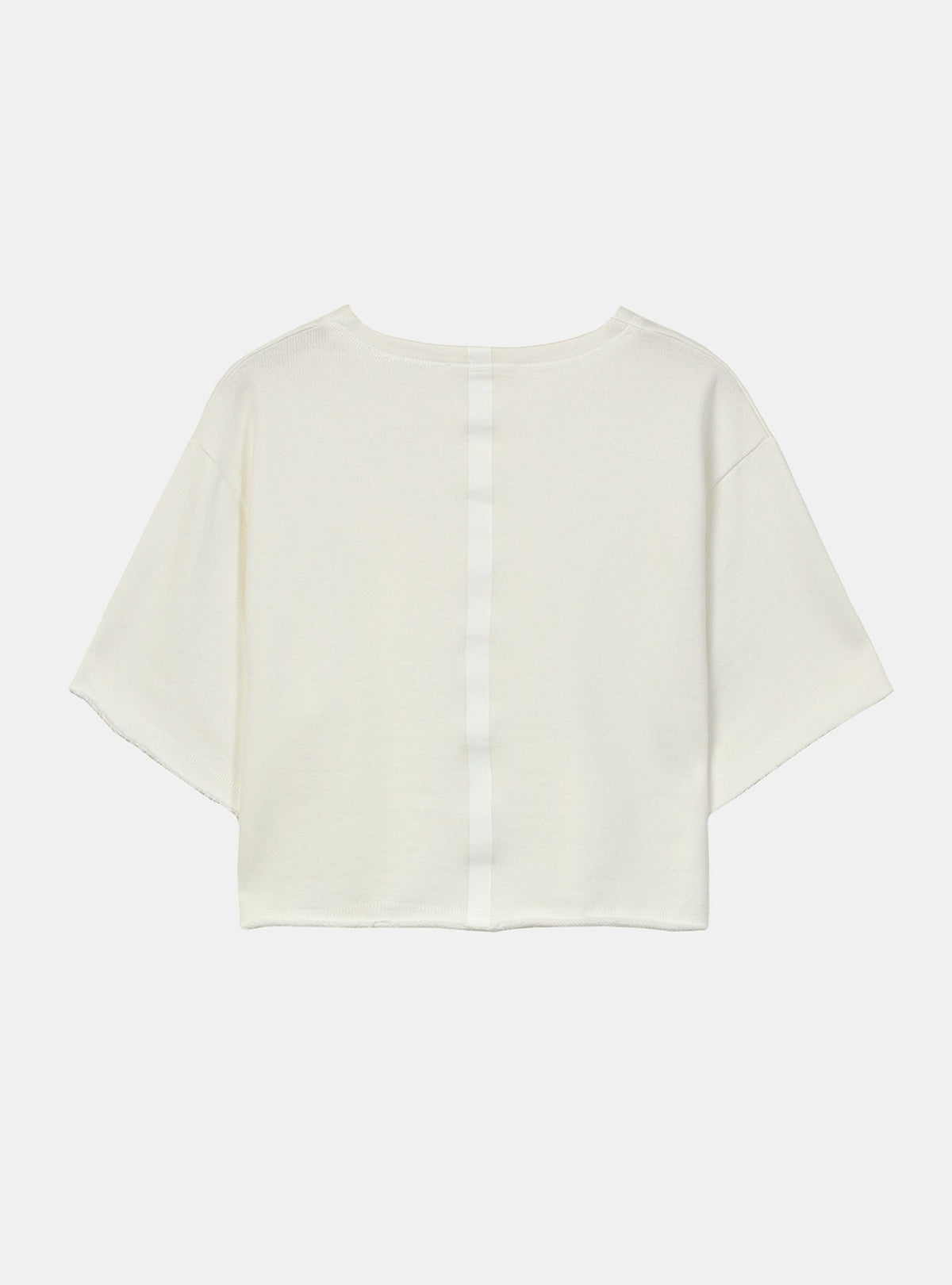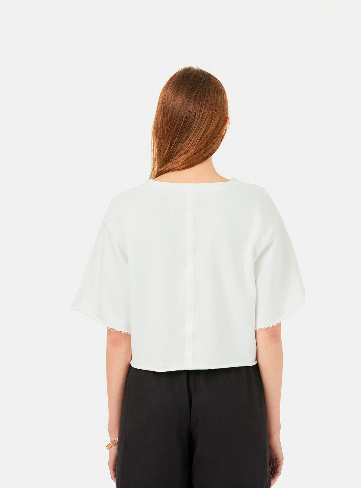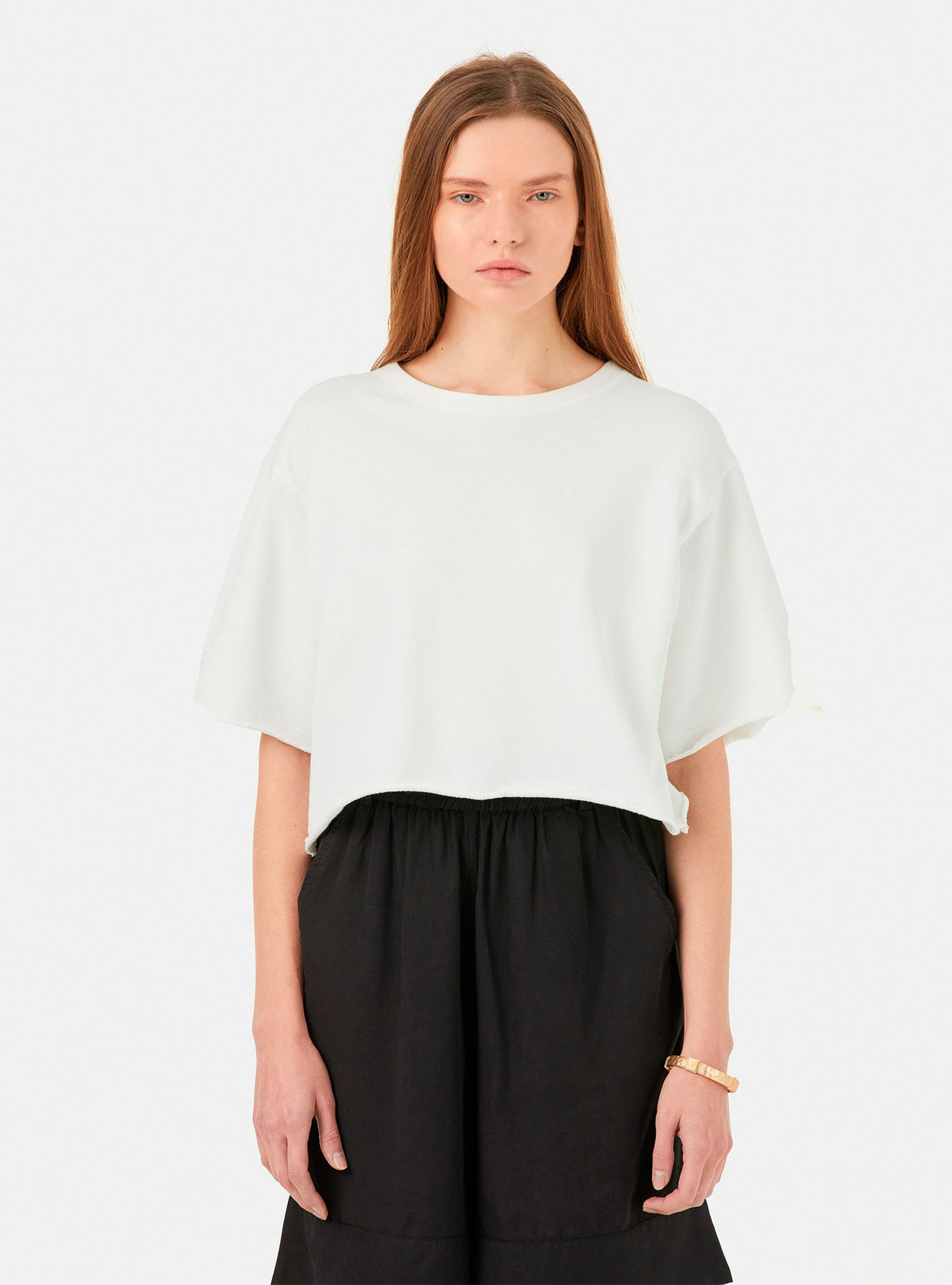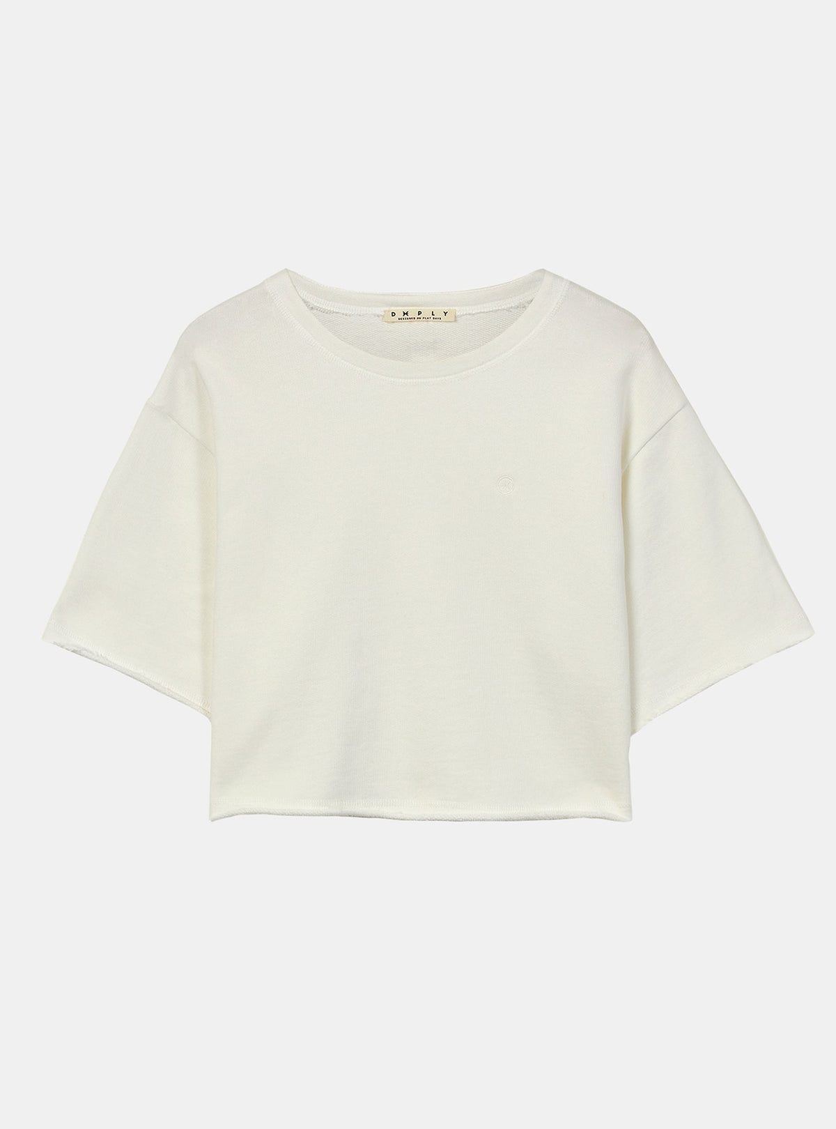 Un T-shirt court en blanc. Les manches et le bas ont des bords définis faits à la main. Fabriqué 100 % en coton molletonné qui est doux au toucher. C’est une nouvelle qualité obtenue à partir de vieux tissus. Un col arrondi avec une finition flatlock. Une broderie de la marque assortie à la couleur de fond au niveau de la poitrine. À l’arrière, une bande imprimée large du haut vers le bas en blanc qui renforce l’esthétique définie.